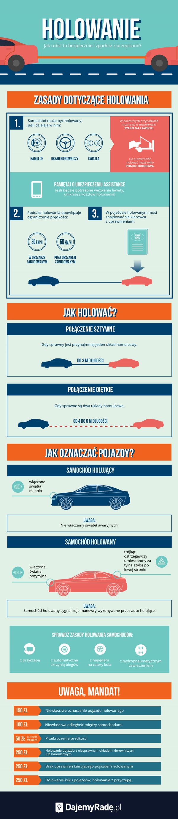 Dajemy radę: Samodzielne holowanie zawsze wiąże się z ryzykiem. Unikniesz go, gdy zdasz się na fachowców. Najprościej wykupić pakiet assistance, dostosować jego wariant do swoich potrzeb. W PZU masz do wyboru ubezpieczenie PZU Auto Pomoc oraz Karty Pomoc w Drodze Polska i Europa. U większości dużych ubezpieczycieli już podstawowy pakiet zapewnia holowanie z każdego miejsca w kraju. Jeśli wyjeżdżasz za granicę, pomyśl o rozszerzeniu go, bo holowanie w innych krajach może okazać się kosztowne.