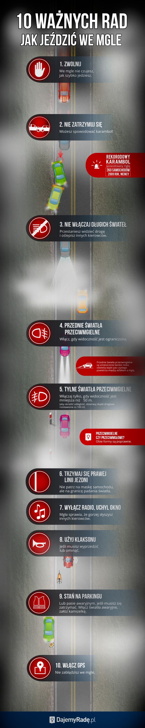Dostosuj prędkość do warunków. Zwolnij, nawet gdy jedziesz drogą szybkiego ruchu. Mgła powoduje, że ulegamy złudzeniu optycznemu, źle oceniamy odległość i prędkość swoją oraz innych samochodów.