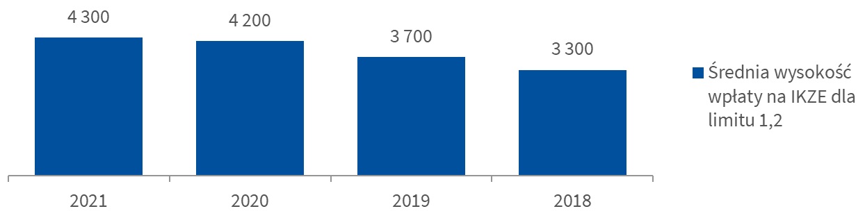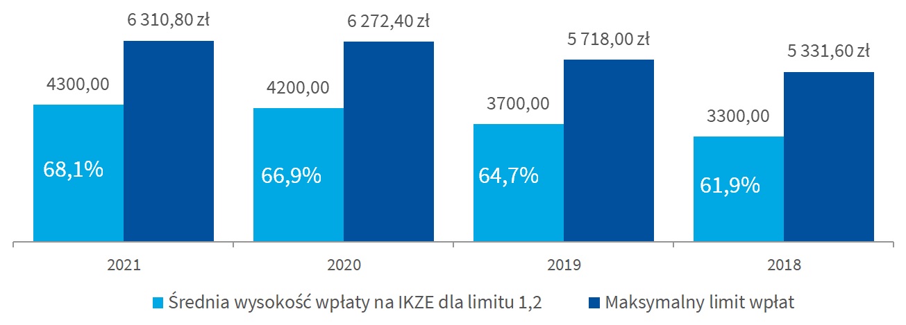 Z każdym rokiem średnia suma wpłat na konto emerytalne IKZE wzrasta wraz z podwyższaniem górnego limitu wpłat na IKZE przez Ministra Rodziny, Pracy i Polityki Społecznej. Uśredniona wartość wpłat w 2021 roku stanowi ponad 68% maksymalnego limitu wpłat i jest to najwyższa wartość zanotowana na przestrzeni ostatnich 4 lat.