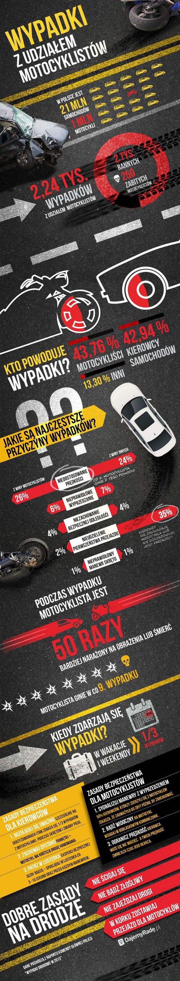 Kierowcy samochodów zarzucają motocyklistom brawurę, która prowadzi do wypadków. Motocykliści skarżą się, że kierowcy celowo zajeżdżają im drogę i narażają ich życie. Jakie są najczęstsze przyczyny wypadków z udziałem motocyklistów? Przyglądamy się policyjnym statystykom, ostrzegamy i radzimy. Przy odrobinie dobrej woli na polskich drogach znajdzie się miejsce dla wszystkich.