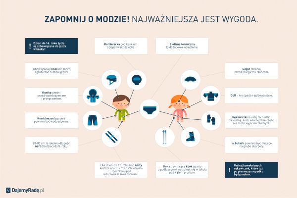 Odpowiedni strój narciarski chroni przed wychłodzeniem, a jednocześnie uniemożliwia przegrzanie. Nie kieruj się modą, tylko wygodą dziecka. Kombinezon, kurtka, rękawiczki muszą być wodoodporne. Dobierz rękawiczki tak, żeby zachodziły na kurtkę. Wtedy śnieg nie dostanie się do środka. Mokre bardzo trudno ponownie założyć. Rękawiczki nie mogą być za ciasne: przy zdejmowaniu ich wewnętrzna warstwa nie powinna wychodzić na zewnątrz – radzi Ewa Silska, trener narciarstwa II klasy i współzałożycielka przedszkola narciarskiego Banda Narciarska.